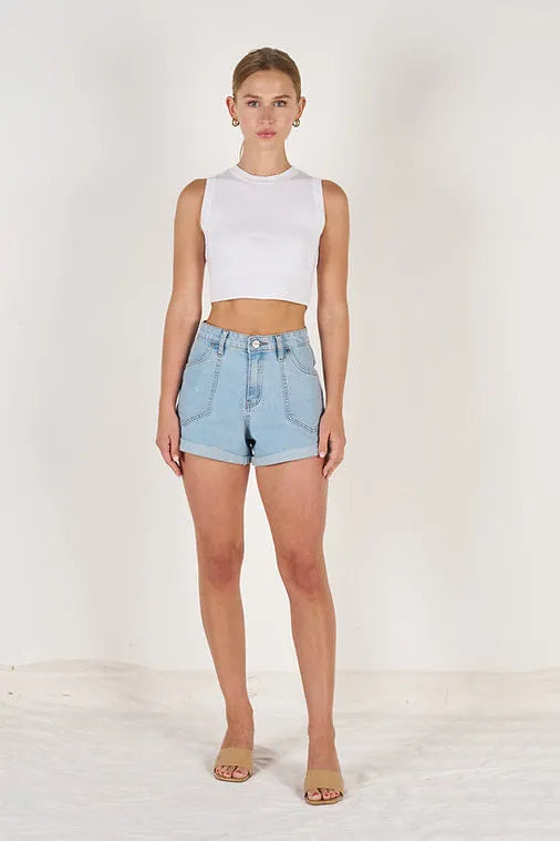 Description: These high-waisted denim shorts feature front patch pockets and a flattering mid-length cut. Made...