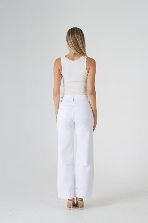 Wakee's best selling patch pocket wide leg jeans in white.. Experience timeless style and comfort...