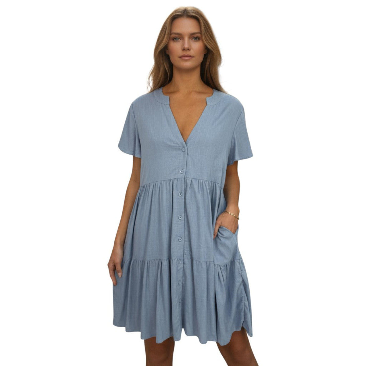 Embrace effortless summer elegance with this rayon V-neck mini dress, designed for warm-weather comfort and...