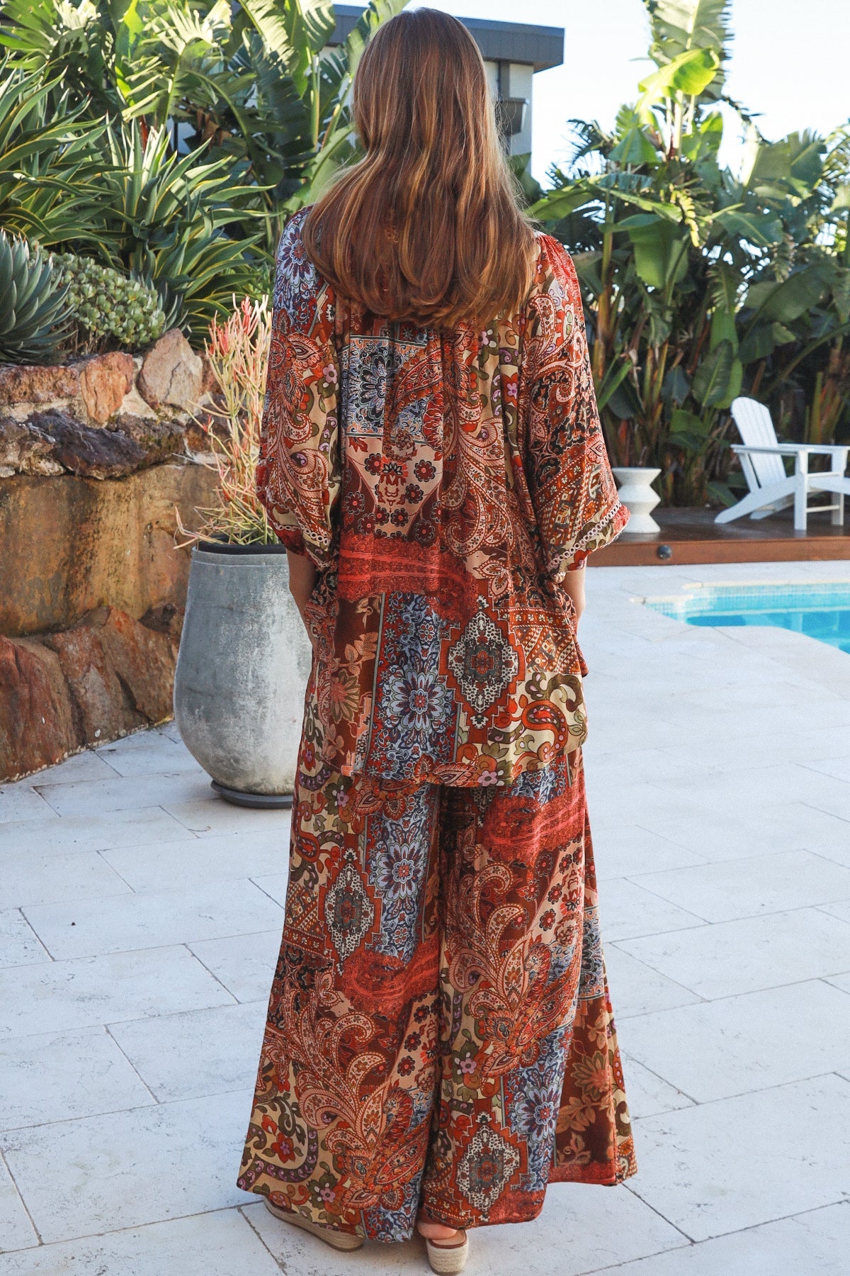 The Nancy Wide Leg Pants feature premium rayon construction in a warm chocolate shade, embellished...
