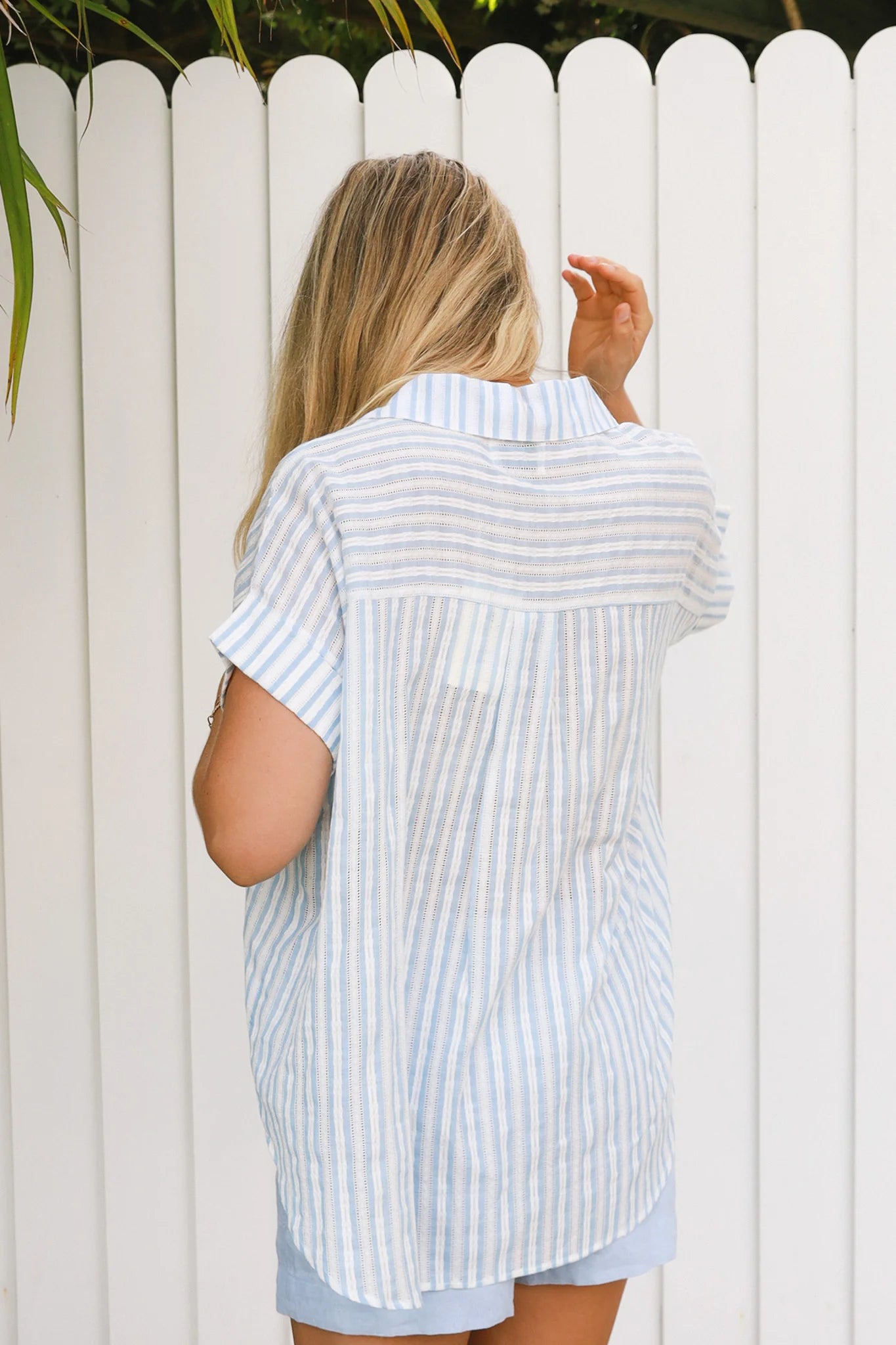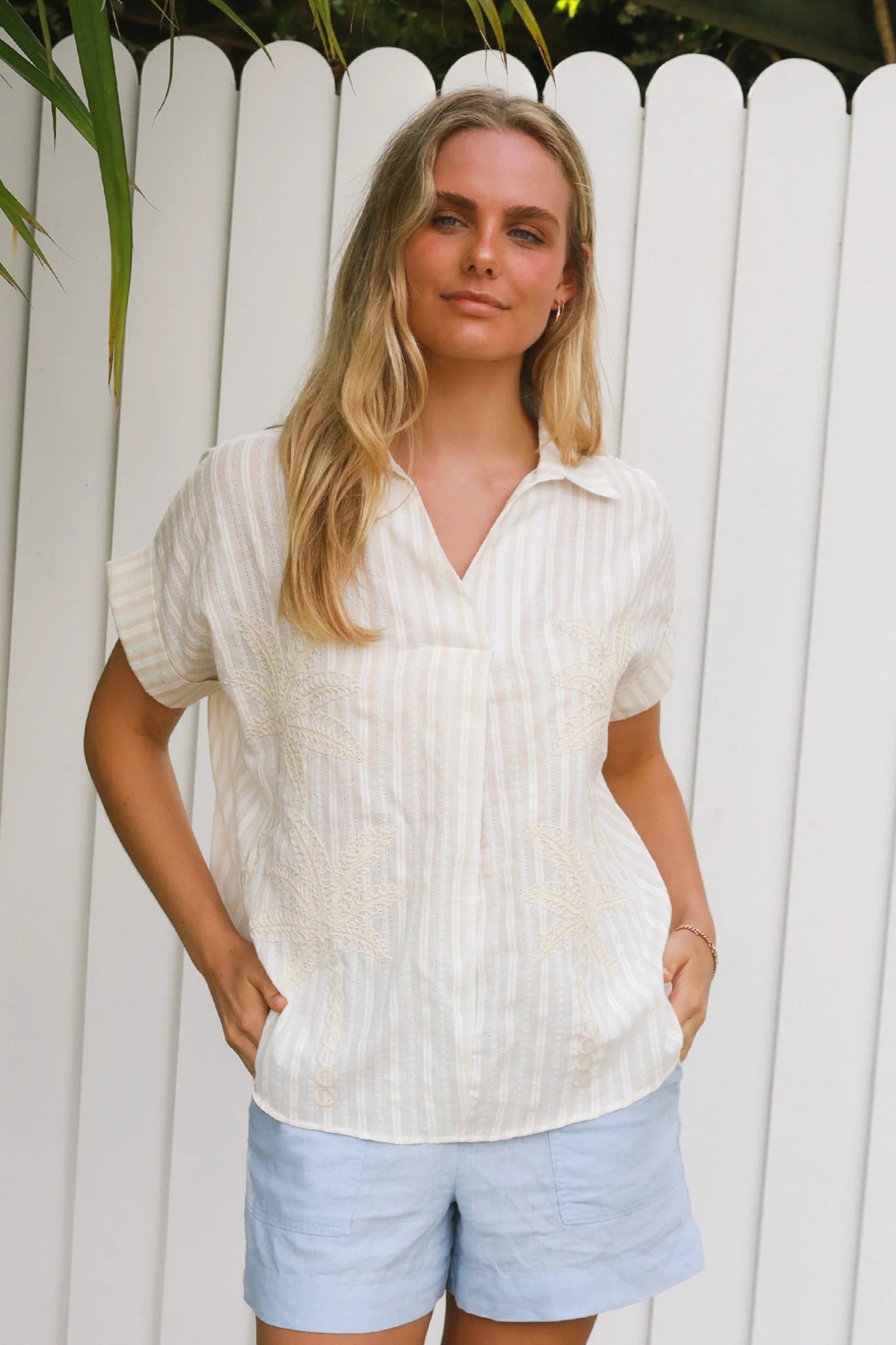 Embrace effortless coastal style with this expertly crafted striped blouse, featuring embroidered palm tree details...