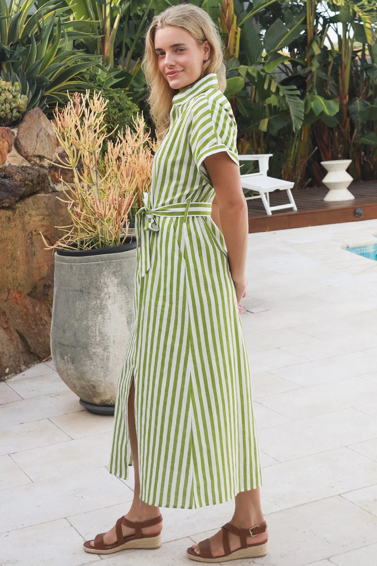 Elevate your warm-weather wardrobe with this striking candy stripe maxi dress. The vertical striping creates...
