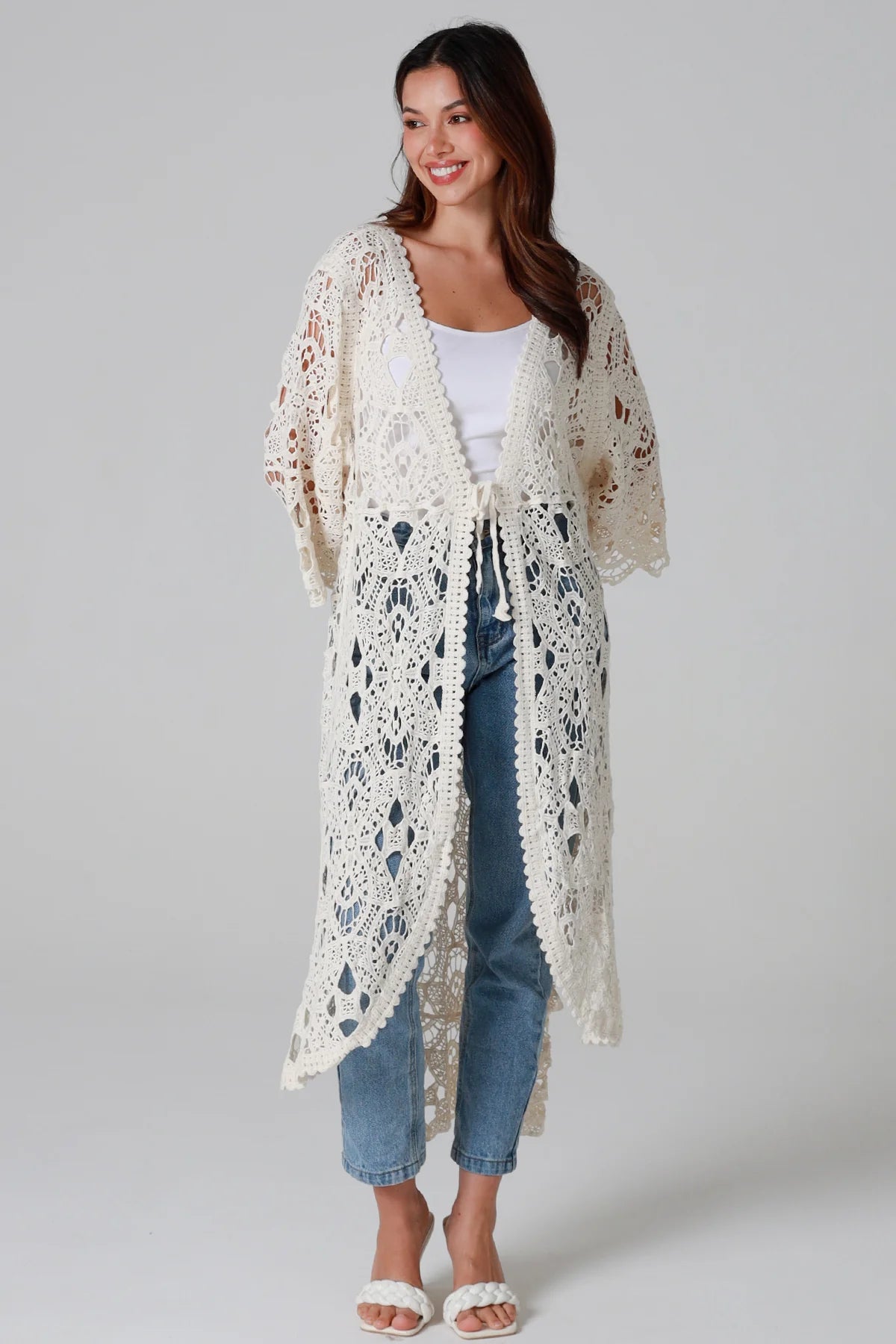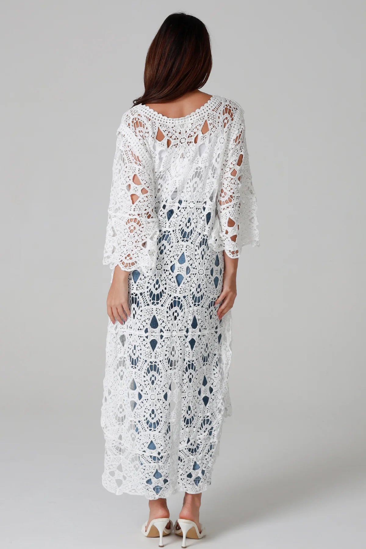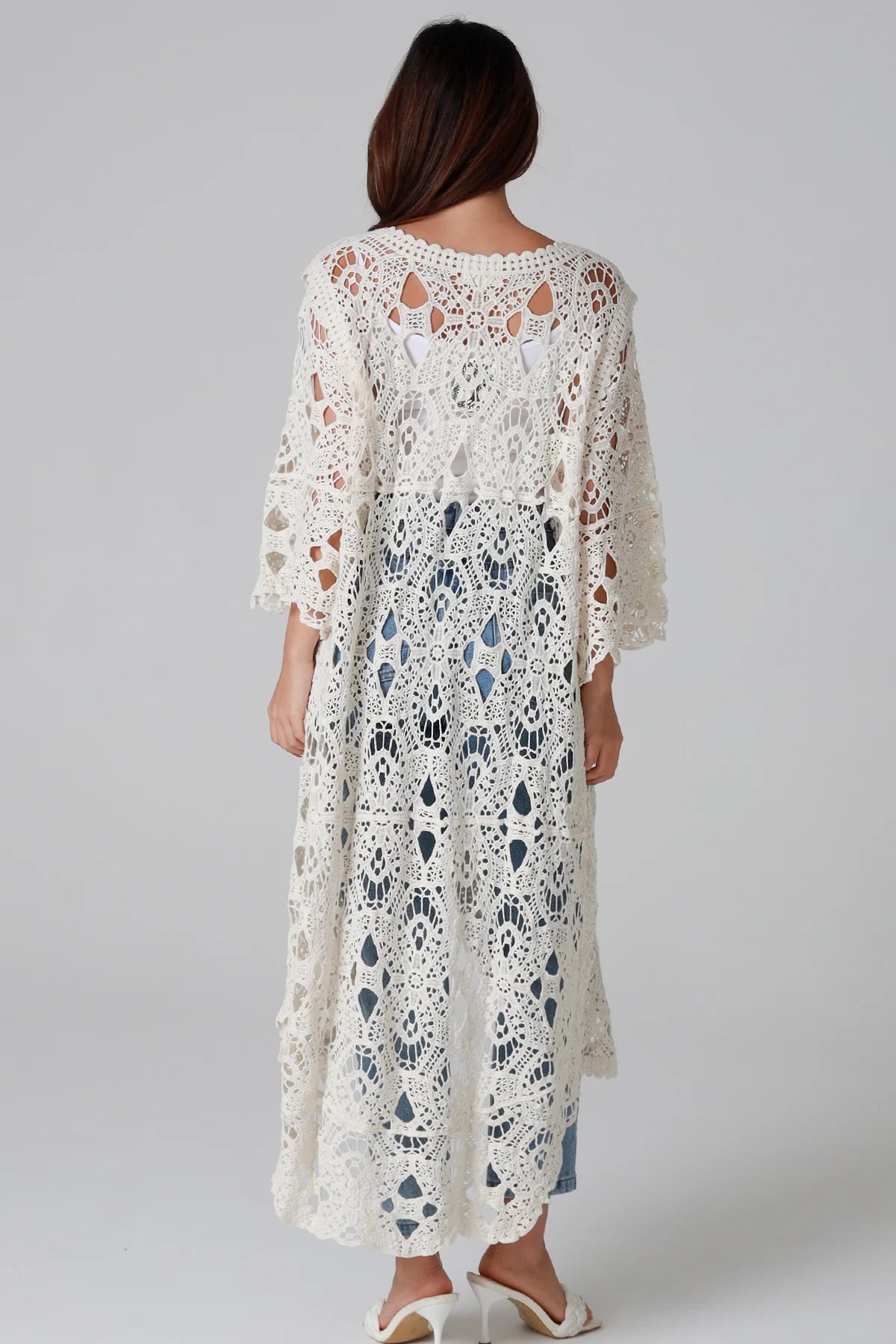 This long cotton crochet jacket showcases authentic bohemian design with meticulous openwork construction. The breathable...