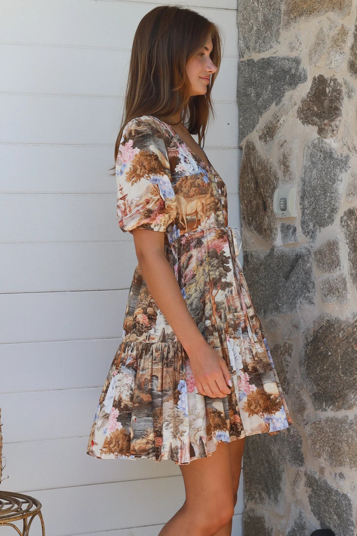 Monnie Baby Doll Mini Dress features a distinctive three-tier silhouette with button detailing on the...