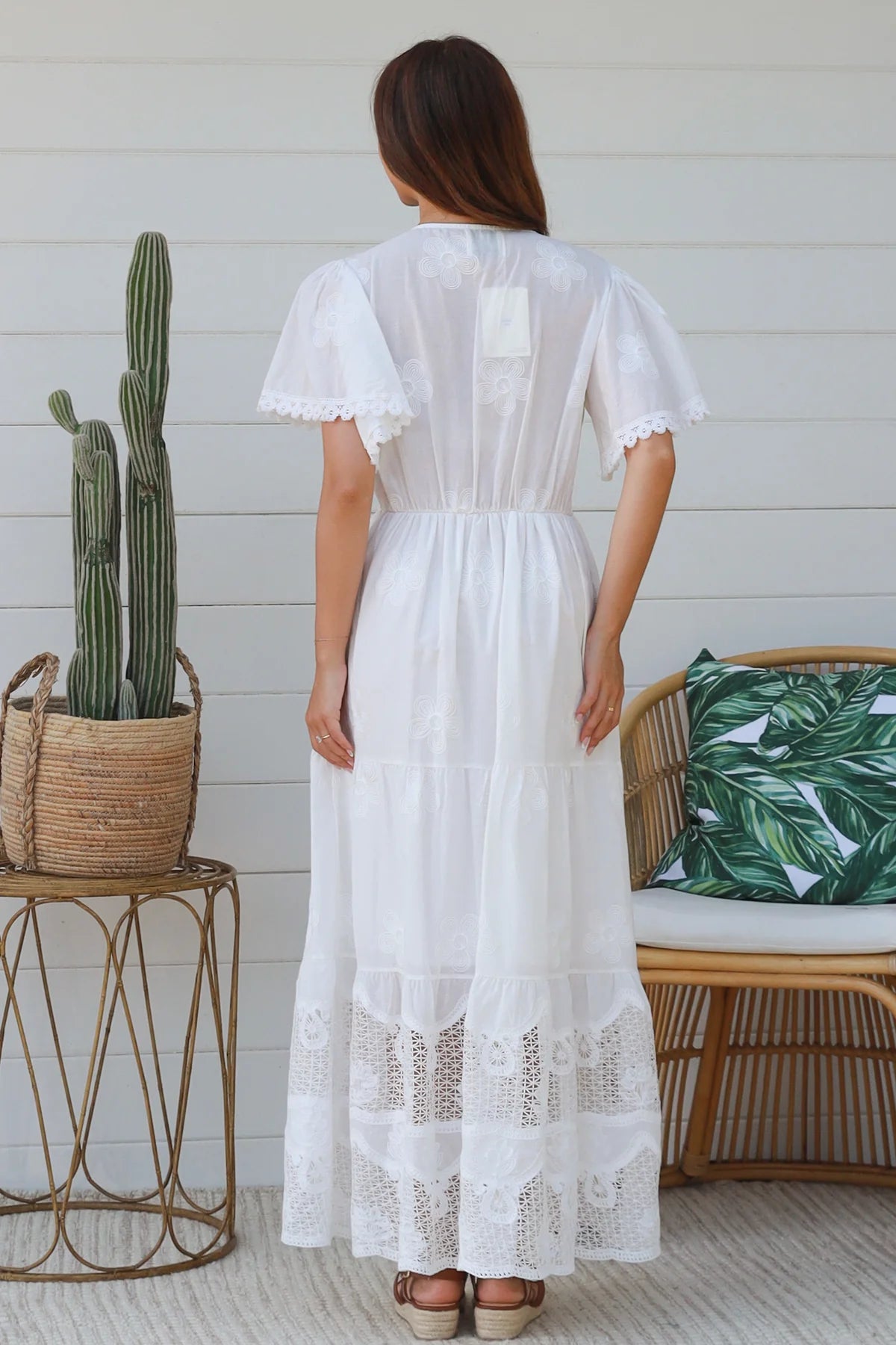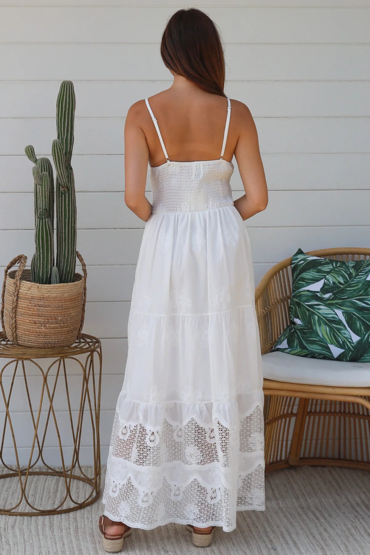 The Dolcie Cap Sleeve Embroidered Maxi Dress features delicate floral embroidery throughout, complemented by intricate...