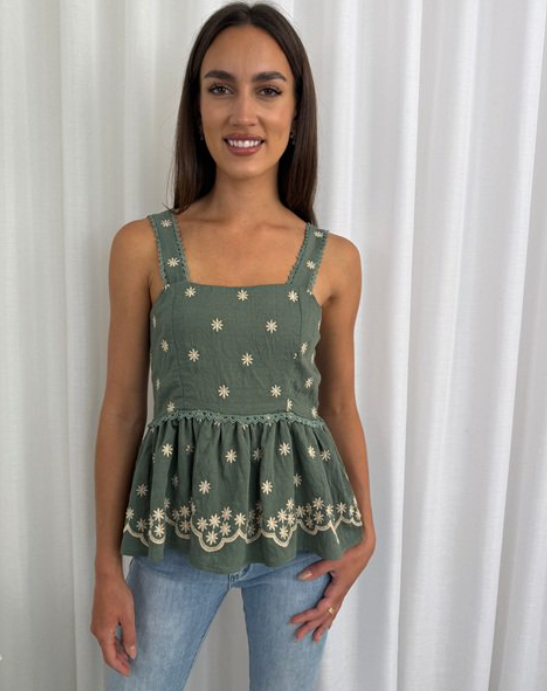 Effortlessly charming, this babydoll tank top features delicate embroidered daisies paired with intricate lace detailing...