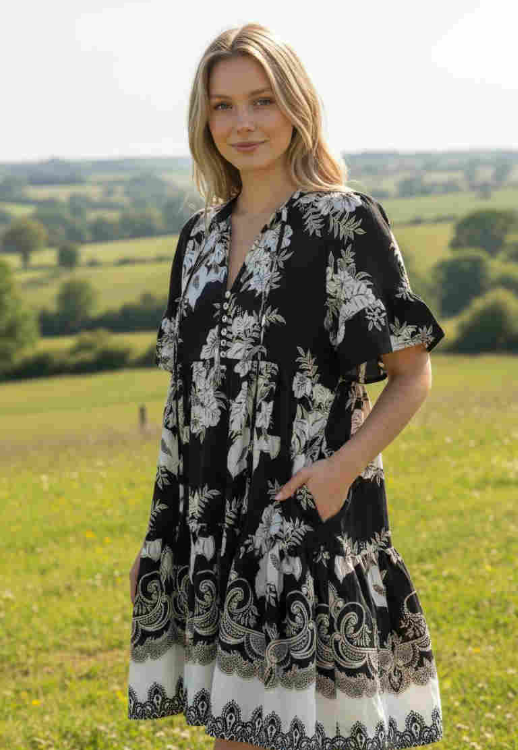 Elevate your wardrobe with this striking paisley mini dress 100% rayon. The two-tier silhouette features...