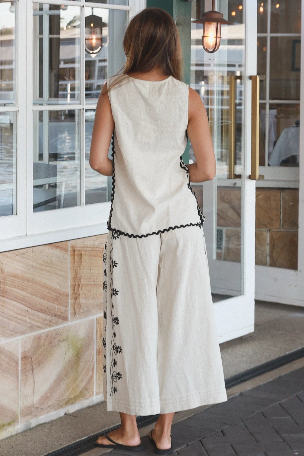Elevate your wardrobe with this sophisticated sleeveless top, featuring delicate ric rac trim and an...