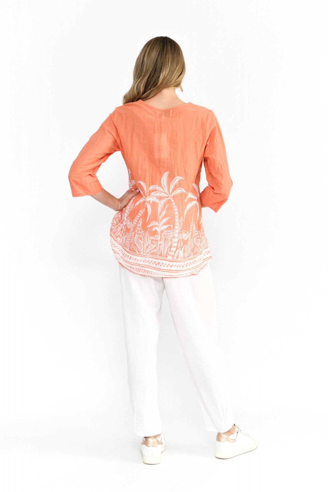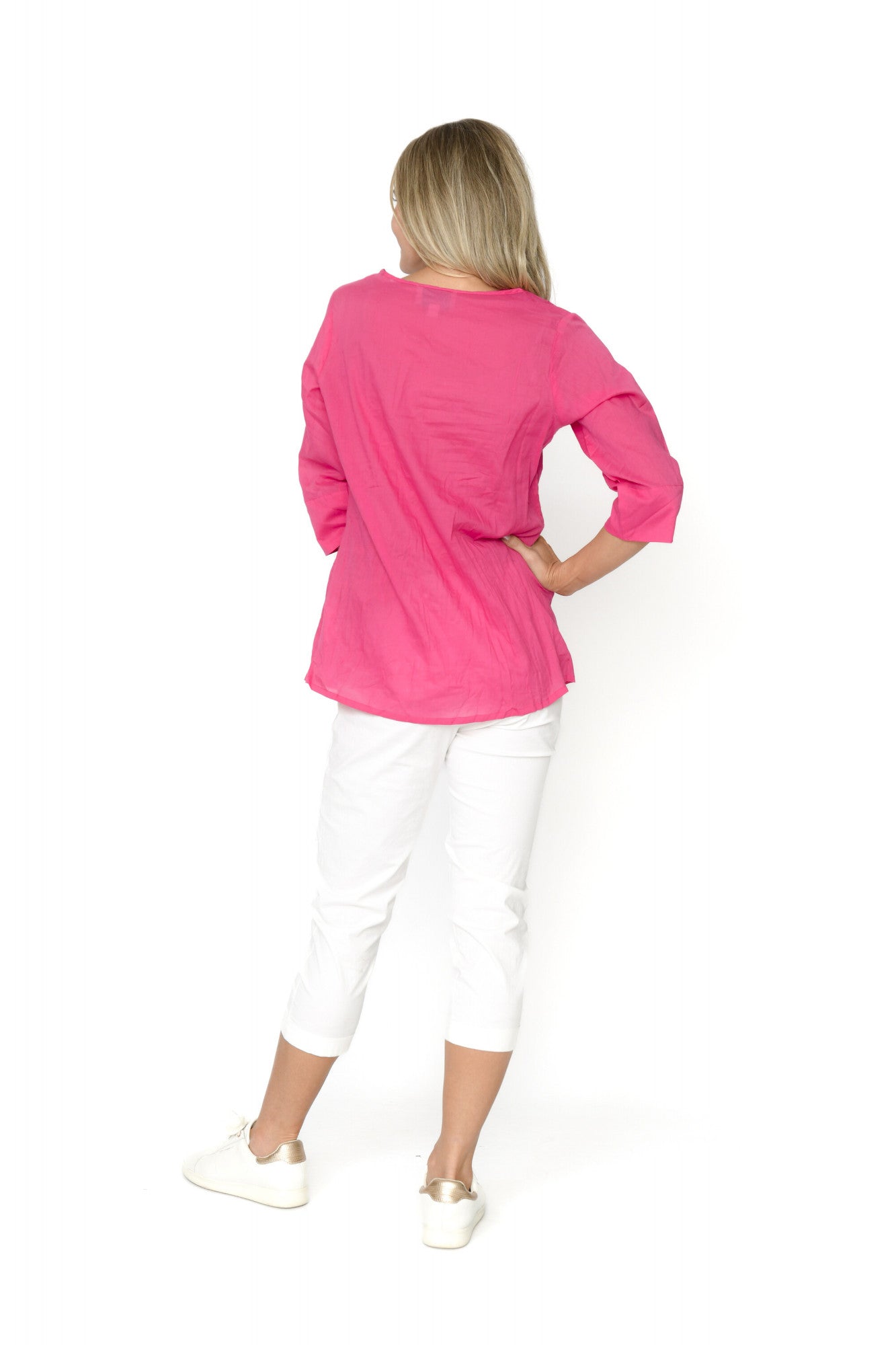The Evie Pleated Top with 3/4 Sleeve is crafted from 100% cotton, offering breathable comfort...