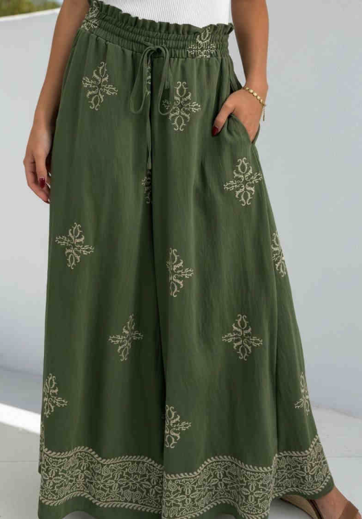 Effortless comfort meets bohemian style with these Elodie Skant Embroidered Wide Leg Pants. Featuring a...