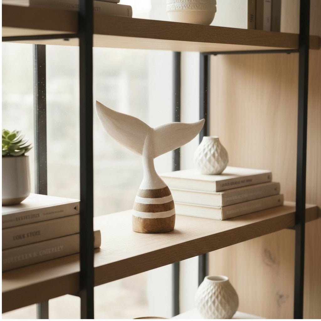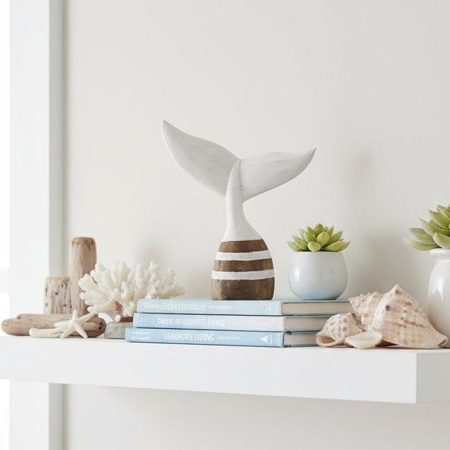 Bring the charm of coastal living into your home with this striking wooden whale tale...