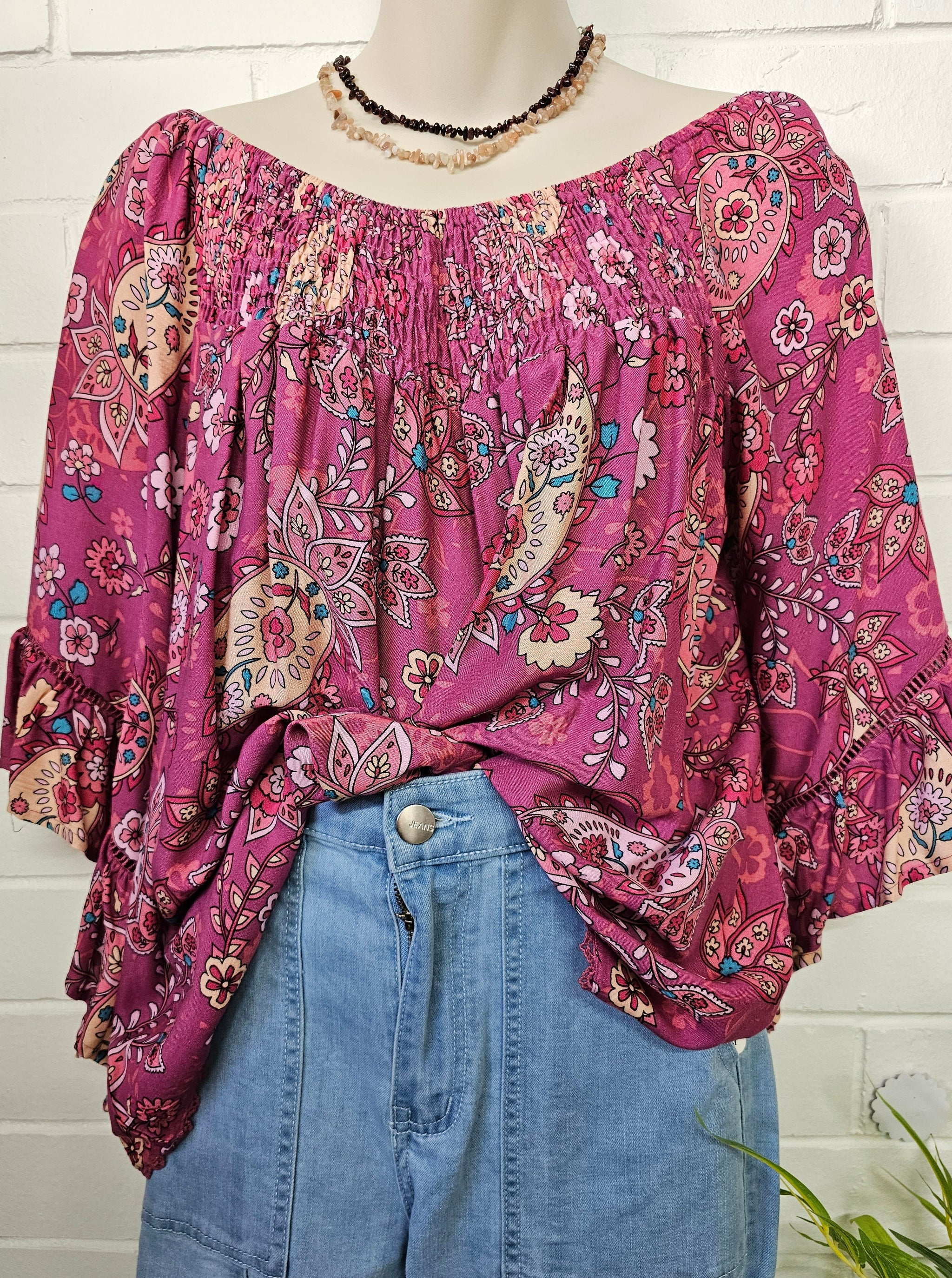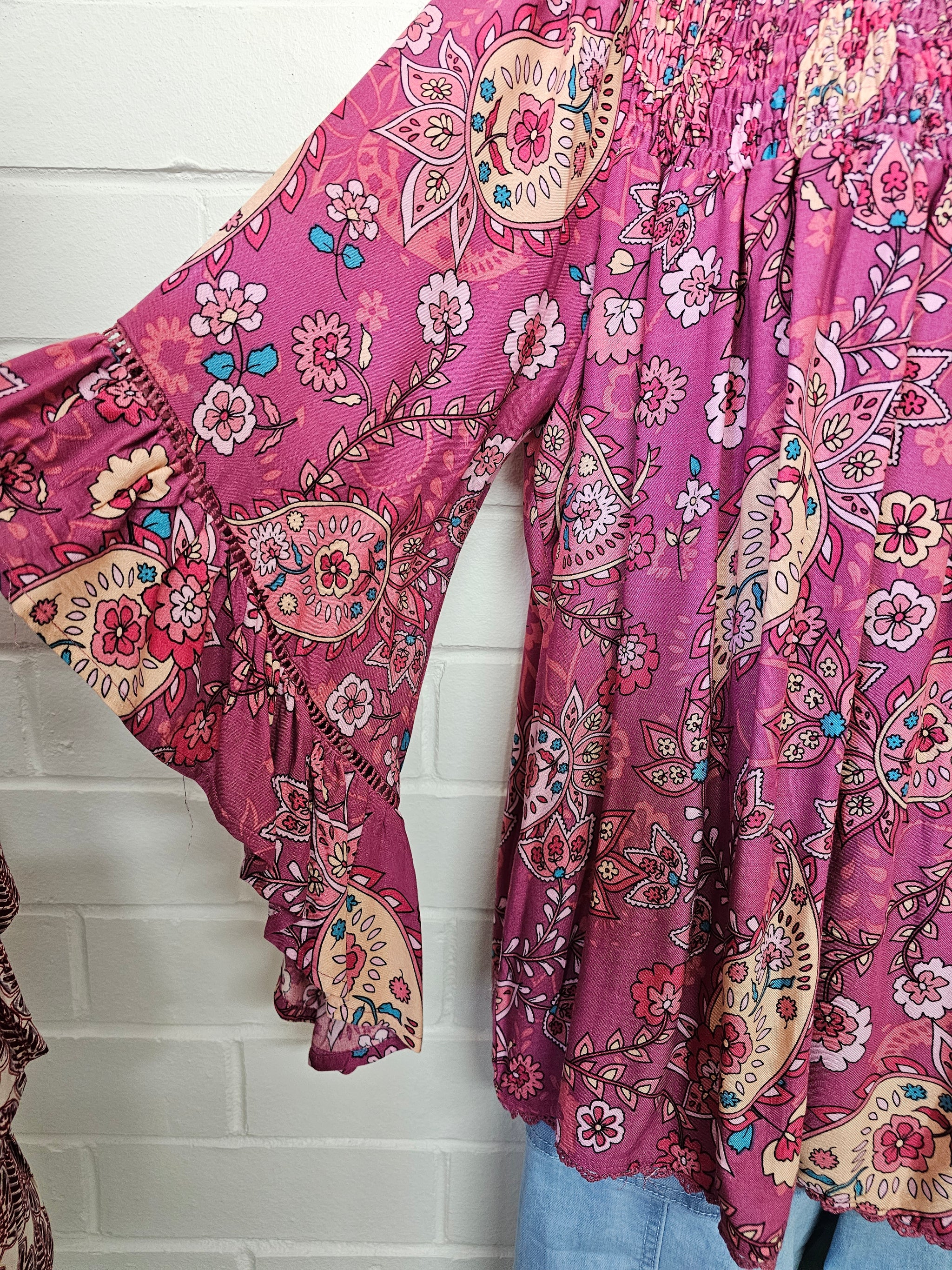 Experience effortless elegance with the Mitsy Shirred Detail Bodice Boho Long Sleeve Shirt. Crafted with...